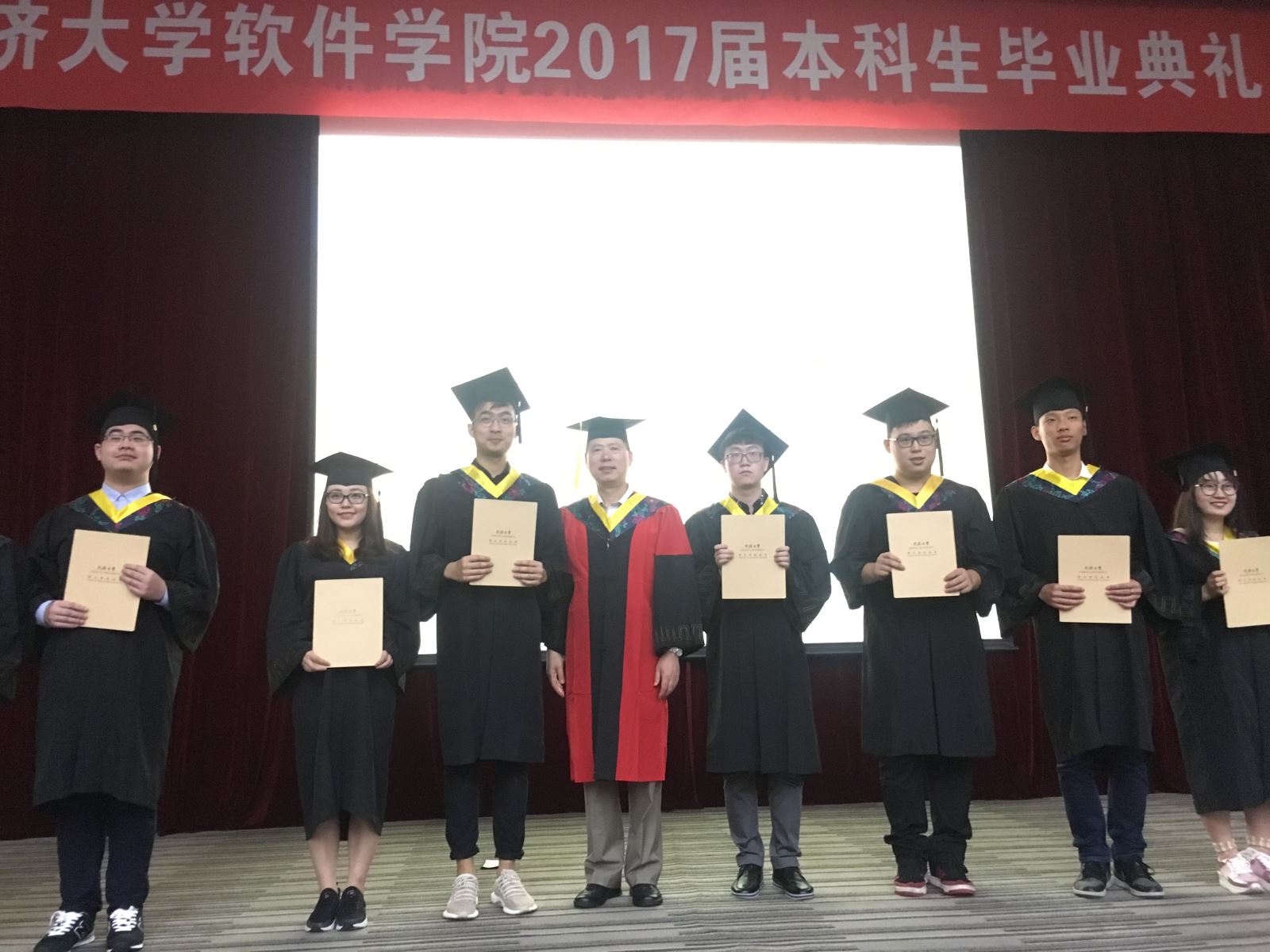 姜富明教授等分别为获得学士学位的毕业生代表拨穗、授予学位证书,并与毕业生合影留念。