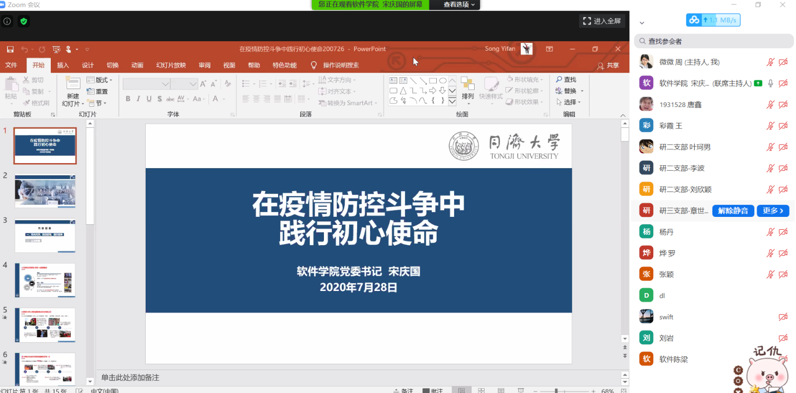 2020年7月28日下午,软件学院党委书记宋庆国同志通过zoom为软件学院全体党员上了题为“在疫情防控斗争中践行初心使命”的党课,学院全体师生党员参加。