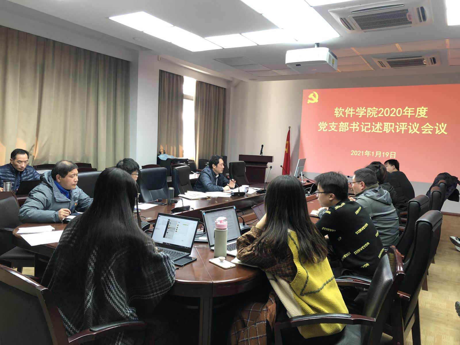 2021年1月19日上午,学院在济事楼417会议室召开了2020年党支部书记述职评议会议,全体党支部书记参加。软件学院党委委员、纪委委员、各支部党员代表作为评议组成员参加会议并进行了现场打分。