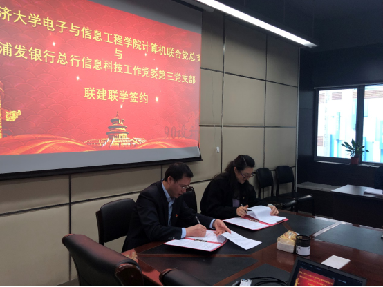 在与会人员和党员代表的共同见证下,浦发银行总行信息科技工作党委第三党支部与学院计算机联合党总支副书记张砚秋签订校企联建联学合作协议书,这也是电信学院进一步加强校企联合,党建引领,践行“三全育人”的重要举措。