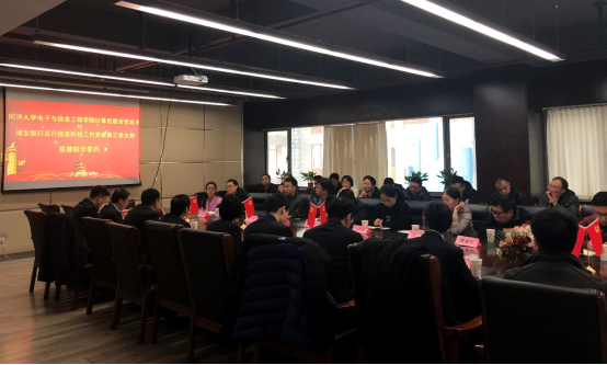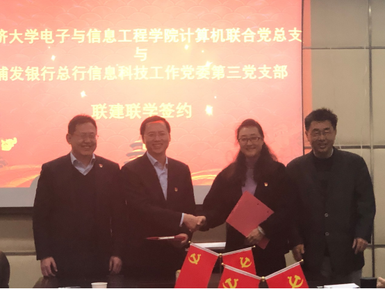 在当前“不忘初心、牢记使命”主题教育的背景下,在践行“三全育人”理念的实践中,2019年12月3日下午,计算机联合党总支与浦发银行总行信息科技工作党委第三党支部联建联学签约仪式在嘉定校区智信馆305室举行。此次共建签约活动也是计算机联合党总支教工第三支部的一次特殊组织生活,活动由支部书记张冬冬主持。学院党委副书记向阳(主持工作)、计算机联合党总支委员、教工第三支部全体党员以及部分学生党员代表,浦发银行科技部副总经理张国栋、吴德柱(第三党支部书记),陈仲肃(第三党支部副书记)等党员代表出席会议。